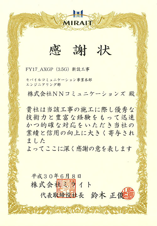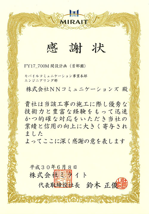 この度、FY17_AXGP(3.5G)新設工事、FY17_700M 開設計画(首都圏)において、高い技術力と的確な施工力が評価され、株式会社ミライト様より感謝状をいただきました。